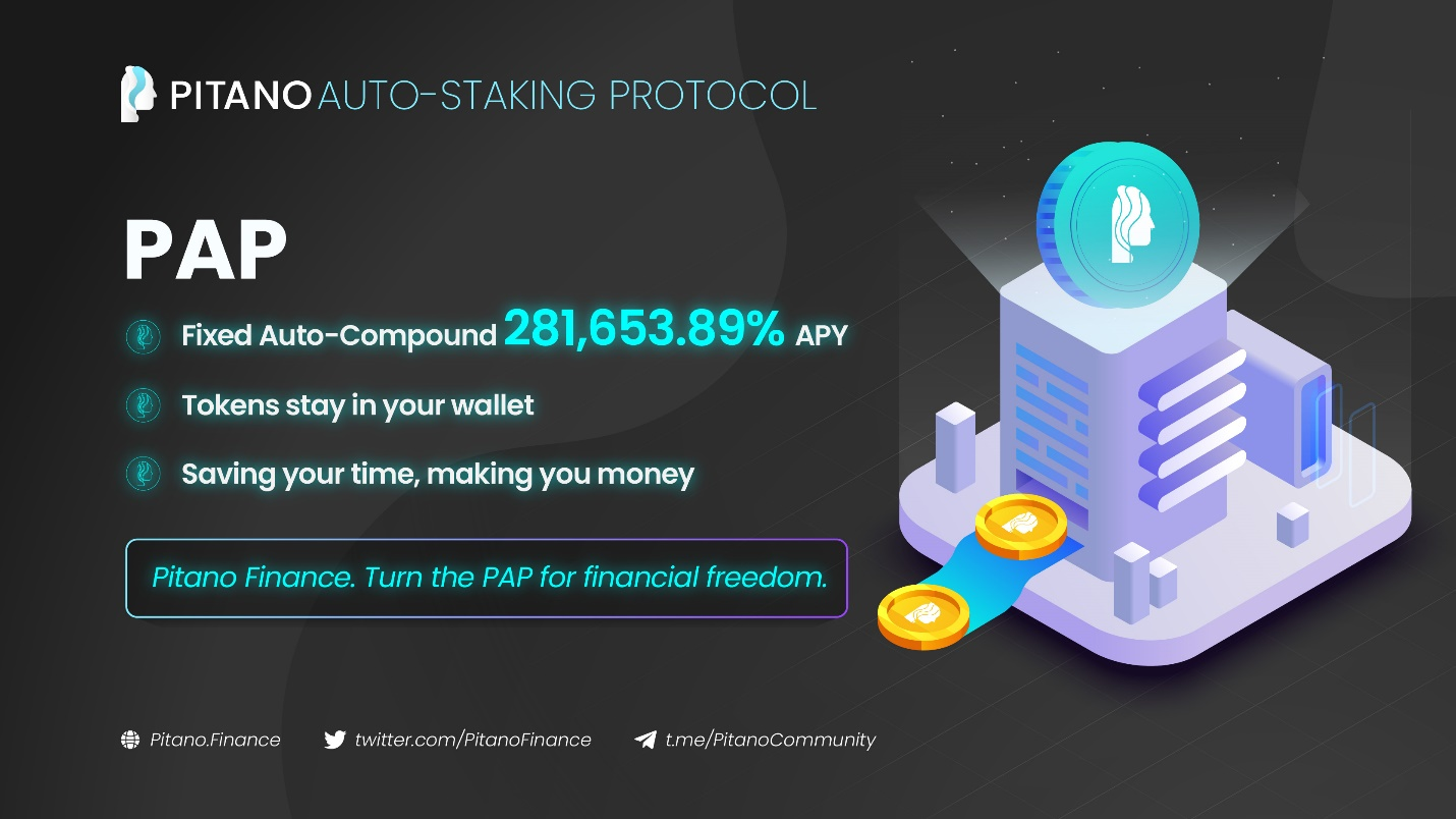 Pitano team allows the holders to combine all their investments and profits, as the protocol automatically rewards holders 2.2% daily with a fixed APY of 281,563.89% rewarded every 10 minutes, 144 times a day.